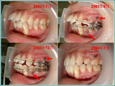 支えを失った歯は、いろんな方向に移動してしまいます。歯周病の治療(歯周病へジャンプ)することで、できる限り再生療法を行い保存していきますが、歯周病を放置しておくと、隣の歯までもが支えを失うことになります。写真1は、だめな歯を抜いた後、両脇の歯を矯正装置を用いて移動する過程で、丈夫な骨ができてきています。そうすることで、元の健康体に近い状態になることができます。