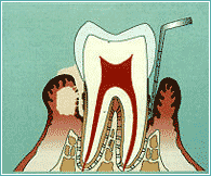 歯周病の進行程度はポケット(歯と歯肉の境の溝)の深さの測定を行うことにより、判断します。ポケットの深さが深ければ深いほど歯周病は進行しているということです。その進行したポケットの中に歯周病菌がひそんでおり、歯肉を腫らすとともに、歯を支えている骨を溶かします。